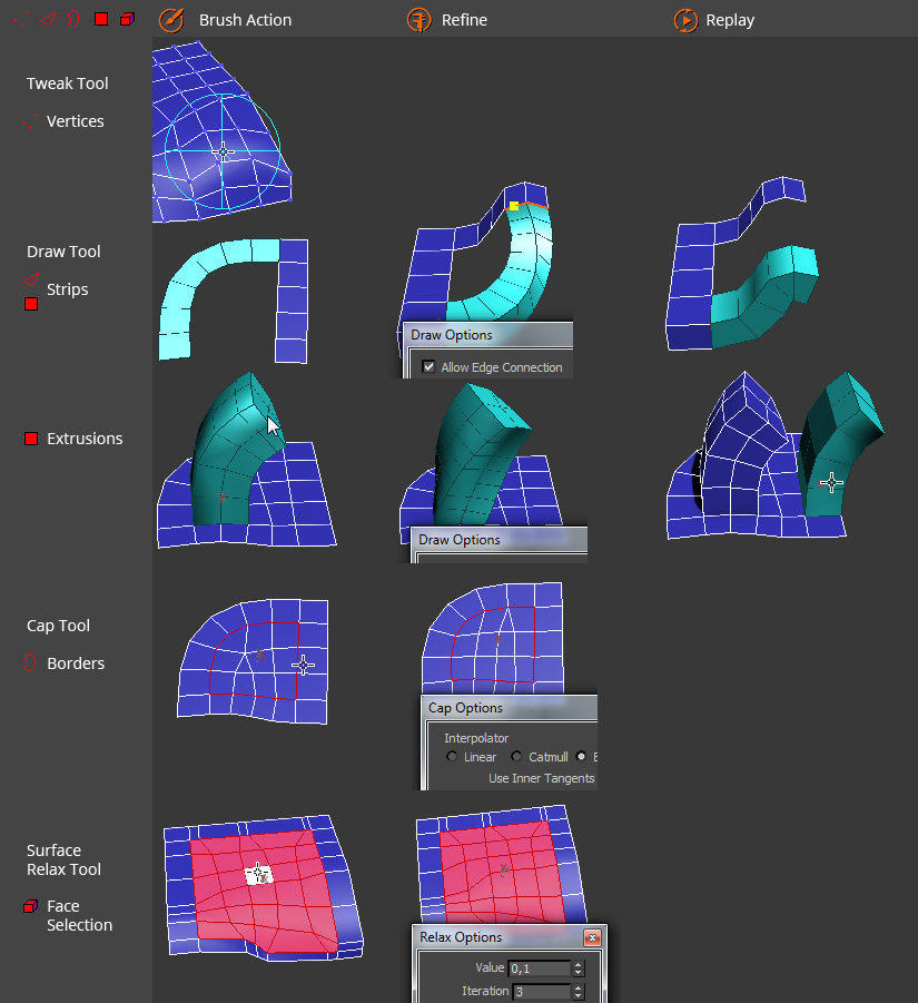 All functionality is provided by a context-sensitive brush tool that operates on editable-polys.